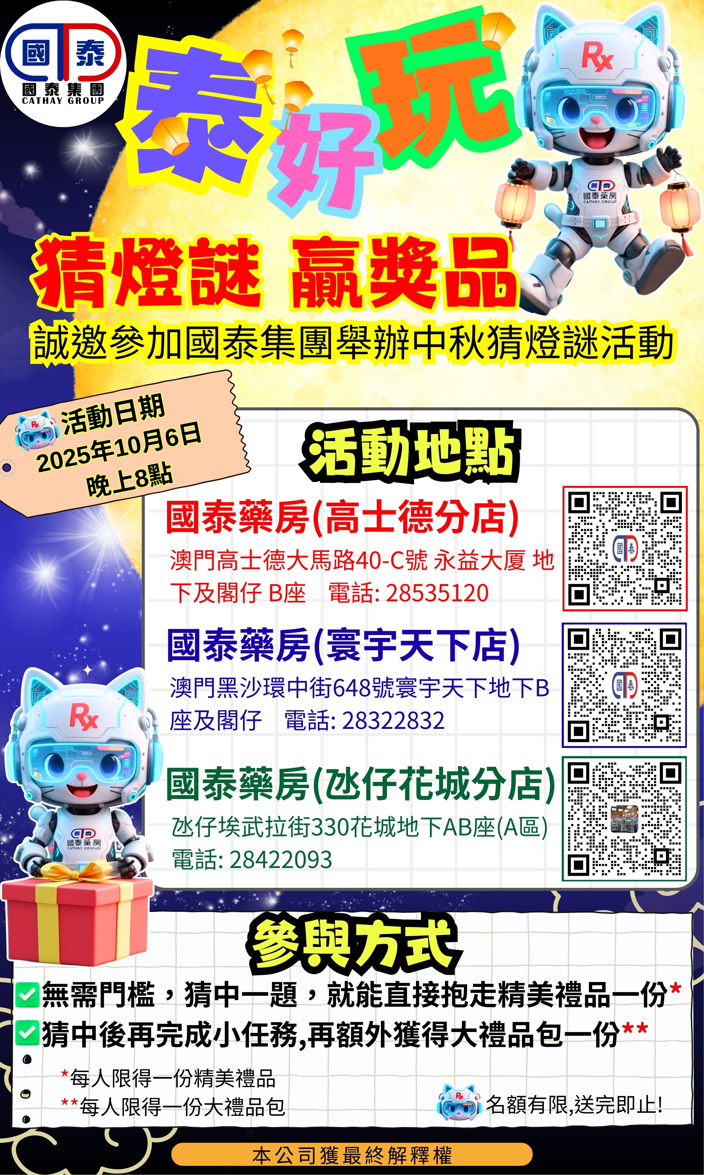 國泰藥房成立於2006年,是澳門領先的連鎖藥房之一。我們擁有近20年的醫藥服務經驗,致力於為市民提供專業、可靠的健康服務。